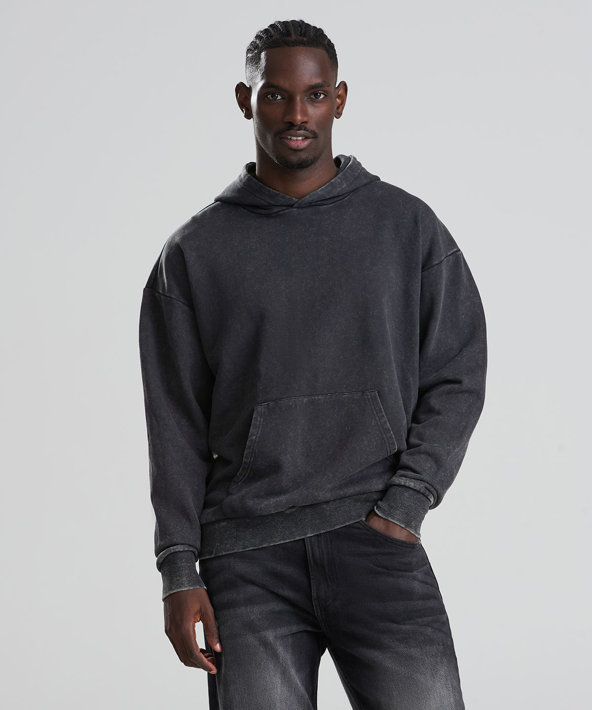 The Vintage washed hoodie combines an oversized fit with a washed finish for a street-ready look. Details include a double-layer hood, kangaroo pouch pocket and a French terry inner for everyday wear. Designed without drawcords for a clean silhouette, it features ribbed cuffs and hem, plus a locker patch and size label only – perfect for easy rebranding. Made with cotton and recycled polyester.
